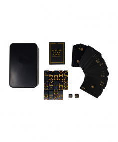 Pass the time with our portable games kit! Included in this customizable gift tin are luxe dominoes, dice, and playing cards. This kit is easy to bring with you on road trips or flights for games night no matter where you are. 4.1" W x 6.7" L x 3.2" H